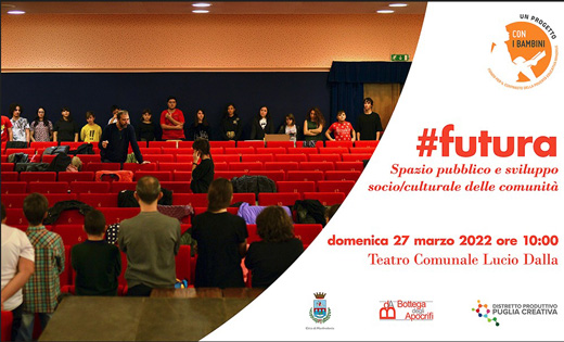 #futura: spazio pubblico e sviluppo socio/culturale delle comunità  è il titolo dell'incontro organizzato da Comune di ManfredoniaDistretto Puglia Creativa e compagnia Bottega degli Apocrifi, in programma domenica 27 marzo 2022 dalle ore 10.00 alle 13.00 al Teatro Comunale "L. Dalla" di Manfredonia.