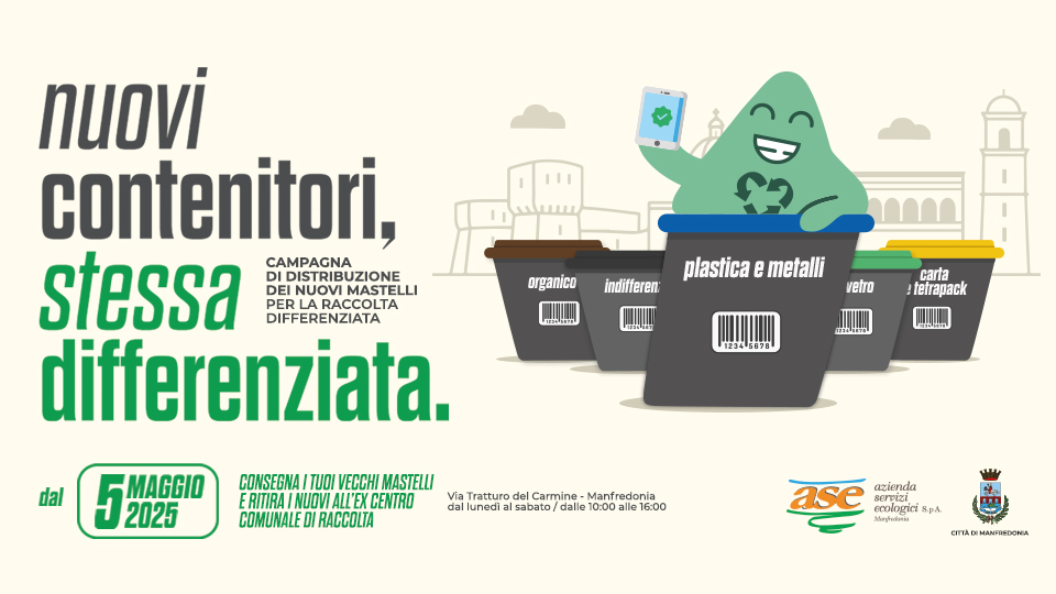 Nei prossimi giorni, infatti, partirà la distribuzione dei nuovi kit di mastelli e carrellati per la raccolta differenziata, acquistati dal Comune di Manfredonia con i fondi PNRR dedicati all'ottimizzazione della gestione dei rifiuti.