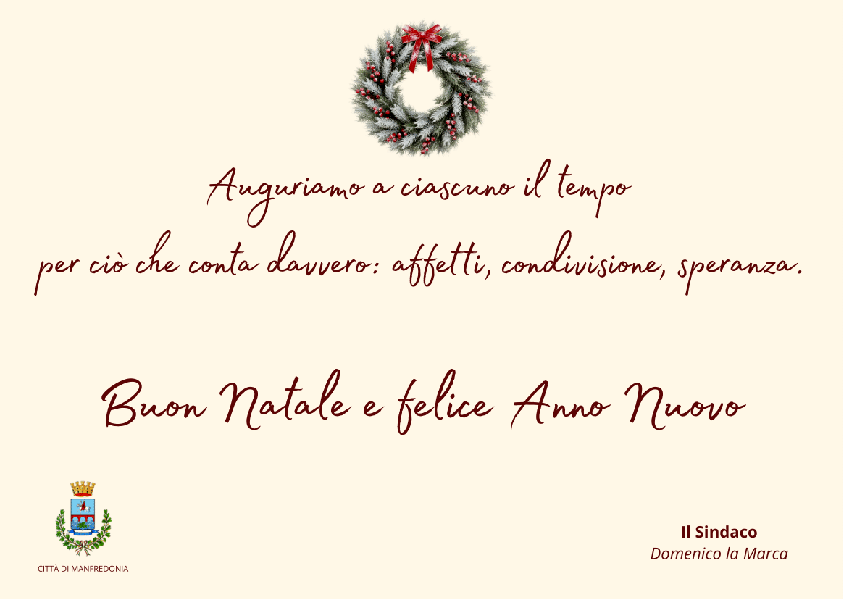 In occasione delle prossime festività natalizie, desidero rivolgere a nome mio personale e dell’Amministrazione comunale i più sentiti auguri di Buon Natale e di un Felice Anno Nuovo.