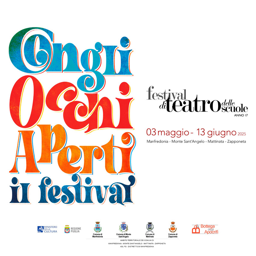 Il Festival “Con Gli Occhi Aperti” è un progetto ideato da Bottega degli Apocrifi. Voluto e realizzato in collaborazione con l’Ambito delle politiche sociali dei Comuni di Manfredonia, Mattinata, Monte Sant’Angelo e Zapponeta. In collaborazione con l’assessorato alla cultura di Manfredonia nell’ambito di Avviso Pubblico, la Casa dello Spettatore di Roma, la rete di scopo teatrale delle scuole e del Comune di Manfredonia, l’IISS Gian Tommaso Giordani – Monte Sant’Angelo, l’IC Ungaretti/ Madre Teresa di Calcutta – Manfredonia e Puglia Culture.