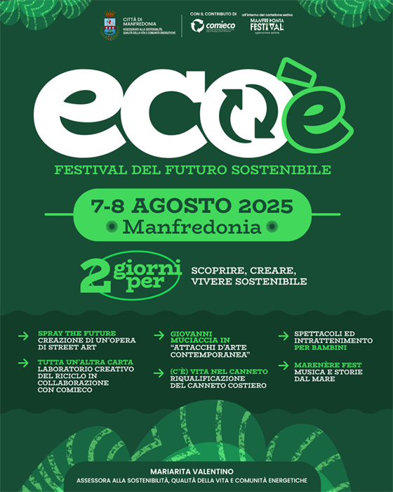 Un’iniziativa a cura dell’Assessorato alla Sostenibilità, Qualità della Vita, Comunità Energetiche, ASE e Bonifiche, guidato da Mariarita Valentino, all’interno del programma del Manfredonia Festival 2025.