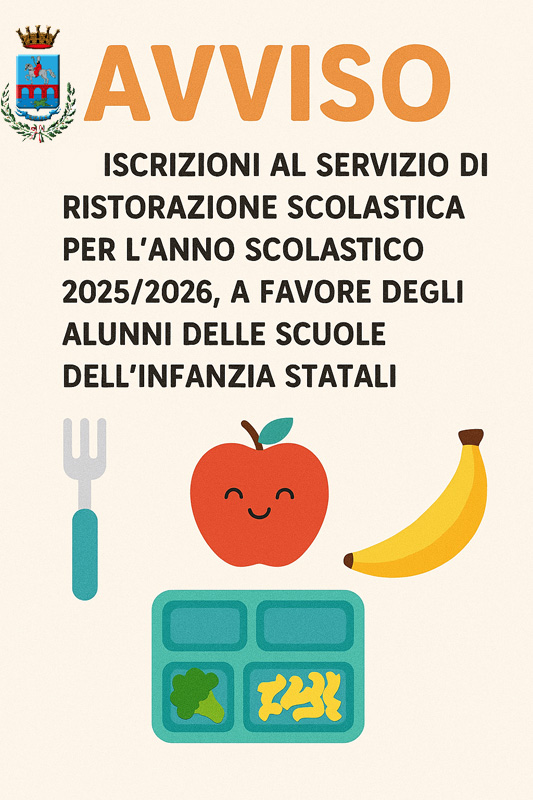 Si rende noto che sono aperte le iscrizioni al servizio di Ristorazione Scolastica per l’anno scolastico 2025/2026, a favore degli alunni delle Scuole dell’Infanzia Statali.